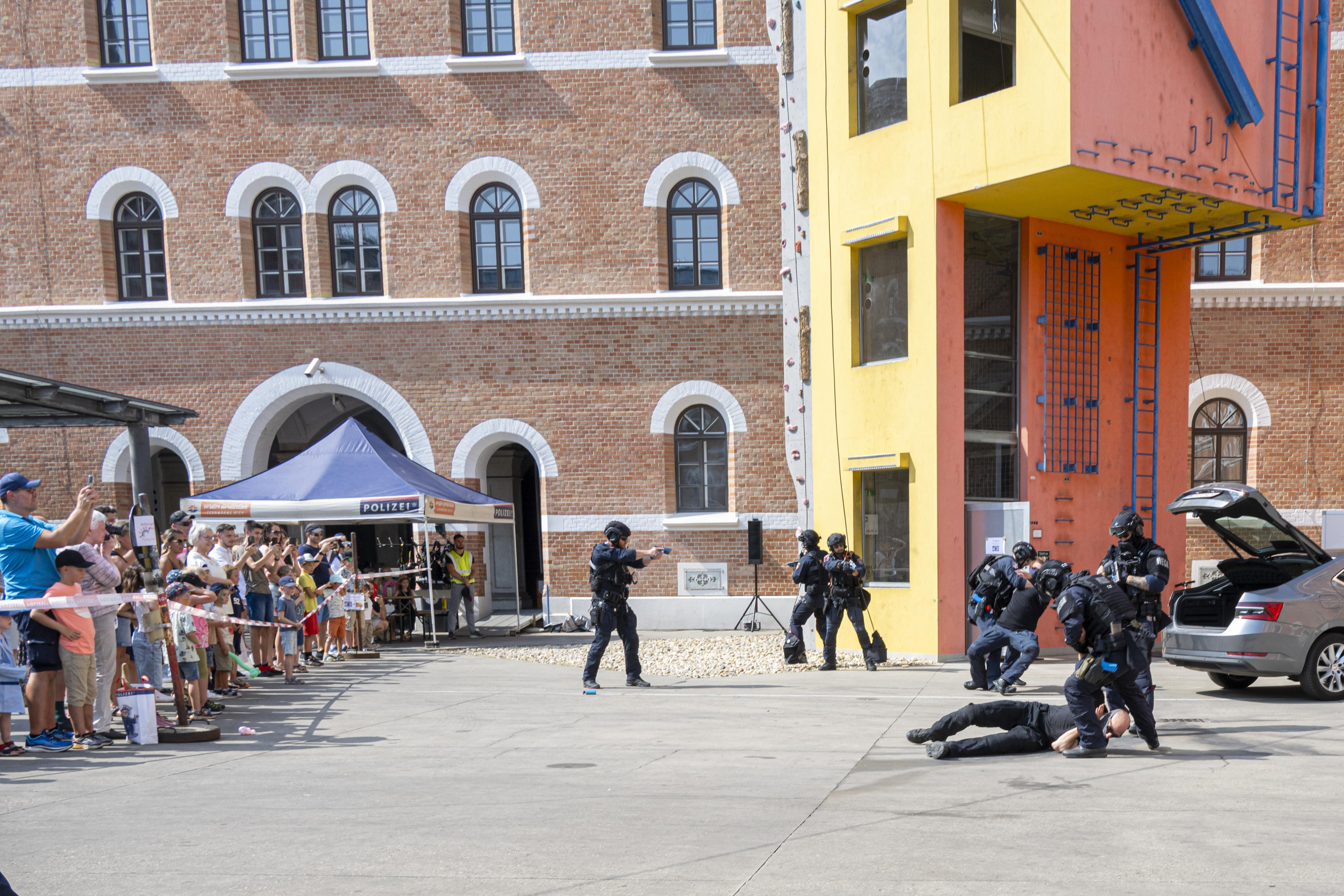 Beim dritten Termin des WIENXTRA – Ferienspiels in der Rossauer Kaserne! Ein Tag voller Action, Spaß und neuer Erfahrungen. Das Beste daran ist aber nicht das Zuschauen. Die Kinder konnten natürlich selbst mitmachen und den Kletterturm erklimmen. Beim Abseilen spürt man richtig, wie das Herz schneller klopft – aber keine Sorge: die Beamten der Sondereinheit haben alle gut gesichert, sodass nichts passieren konnte.