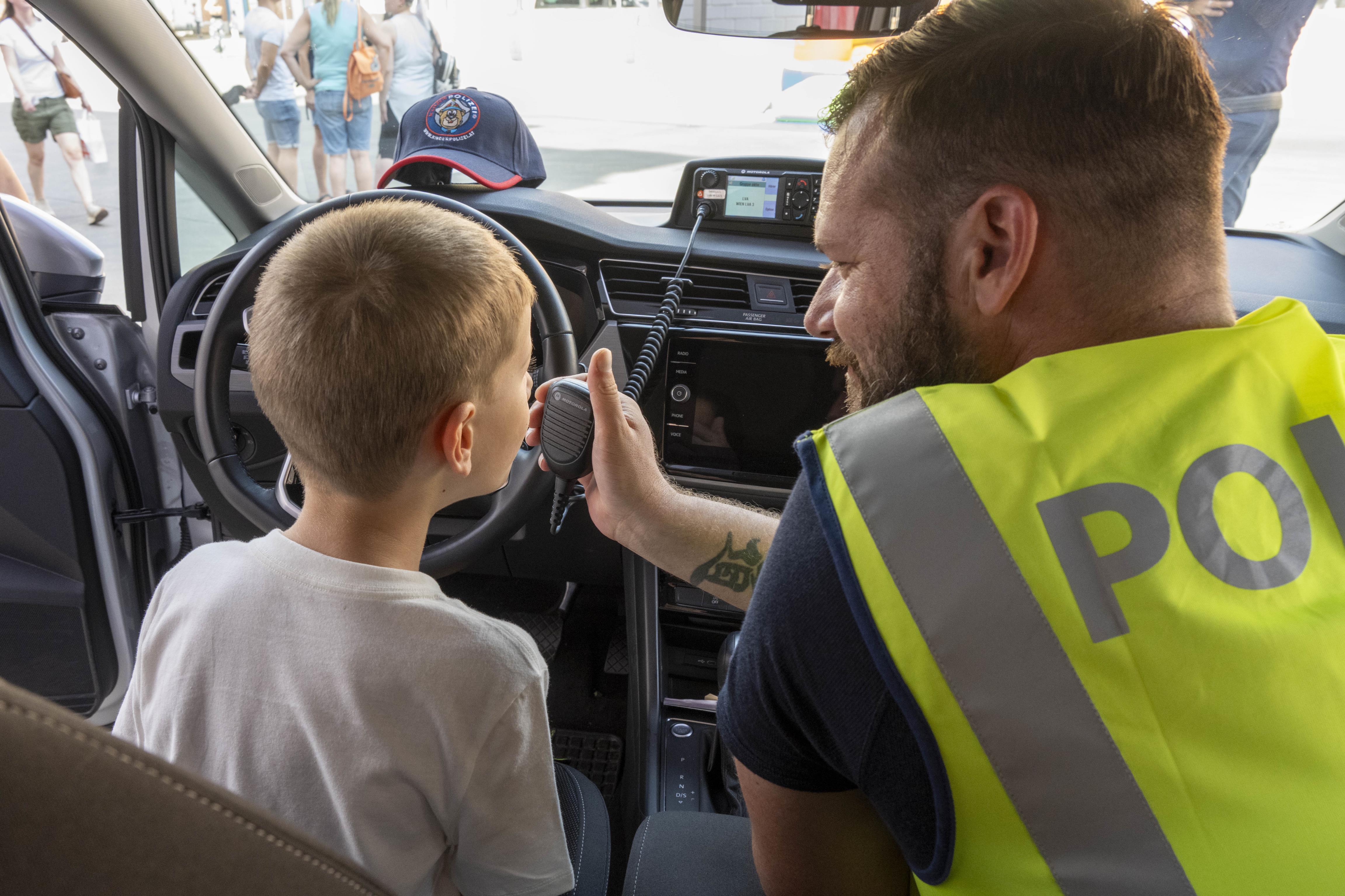 Da standen also die Fahrzeuge der WEGA, das Polizeimotorrad, der LKW und auch unser Gustav. Kennst du Gustav schon? Das ist unser sprechender Funkwagen. Es ist immer ganz lustig, wenn sich die Kinder zu ihm setzen. Gustav erzählt dann immer wieder spannende Sachen. Vielleicht bist du ja selbst schon mal drinnen gesessen und konntest mit ihm reden.